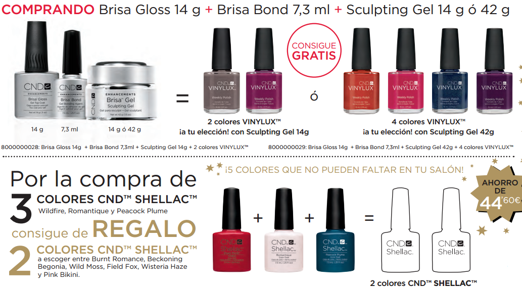 Comprando Brisa Gloss 14 g + Brisa Bond 7,3 ml + Sculpting Gel 14 g ó 42 g consigue gratis 2 colores Vinylux a tu elección con Sculpting Gel 14 g ó 4 colores Vinylux a tu elección con Sculpintg Gel 42 g.